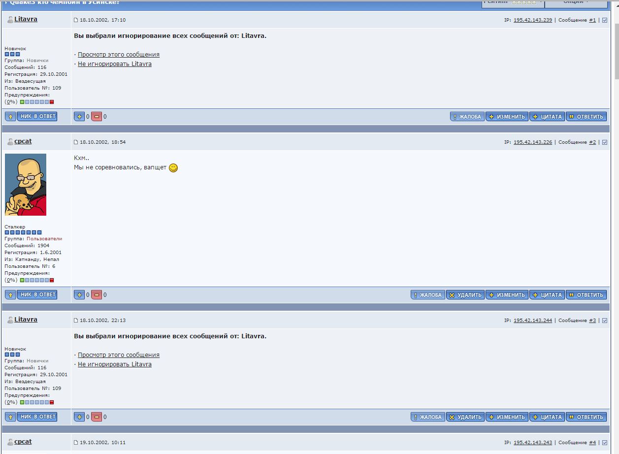 - Модернизировать систему игнора (в частности, чтобы совсем не было видно активности пользователей помещенных в игнор лист) как ты себе это представляешь? что бы и цитаты ответа на чужой пост вырезало? - это не реализуемо -------------------- "Алкоголь - это не моя тема" ©