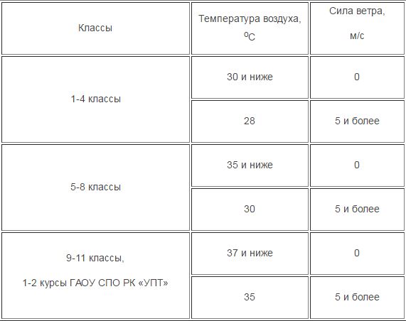 1. Считать для муниципальных образовательных организаций с учетом возраста детей актированными днями дни при следующих погодных условиях: 1.1 Понижение температуры воздуха и сила ветра: 1.2. Сильный ветер — средняя скорость ветра от 15 до 20 м/с; — средняя скорость ветра при порывах от 25 м/с и более. 1.3. Сильный дождь – количество осадков 50 мм и более за 12 часов и менее. 1.4. Ливень – количество осадков 30 мм и более за 1 час и менее. 1.5. Продолжительный дождь: — количество осадков за 2-5 суток, не менее 120 мм; — непрерывный дождь в течение 3 суток и более, могущий вызвать паводок, затопление. 1.6. Град – осадки любой продолжительности диаметром градин 20 мм и более. 1.7. Сильный снегопад – выпадение снега в течение 12 часов и менее 150 мм. 1.8. Сильная метель – общая или низкая метель и дальность видимости не более 500 м при скорости ветра 15 м/с и более. Информирование населения об актировании учебных занятий по-прежнему будет проводиться через средства массовой информации: МУП «Телерадиокомпания «Усинск», официальный сайт Управления образования администрации МО ГО «Усинск» (http://усинск-обр.рф/). -------------------- "Я люблю этот город, но зима здесь слишком длинна" (С)