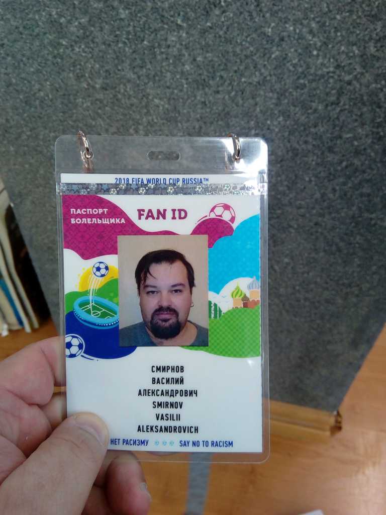 Что то ксива какая то беспонтовая. Фотку любую можно вклеить :-). ПС. И это надо заморачиваться чтобы пропустили на площадь, с экранов игру посмотреть? нет, на Фанфесты вход свободный. Паспорт болельщика нужен только обладателю билета, чтобы пройти на стадион, а также для пользования дополнительными сервисами для зрителей (бесплатный проезд, безвизовый въезд в страну). -------------------- Не думай о людишках свысока.