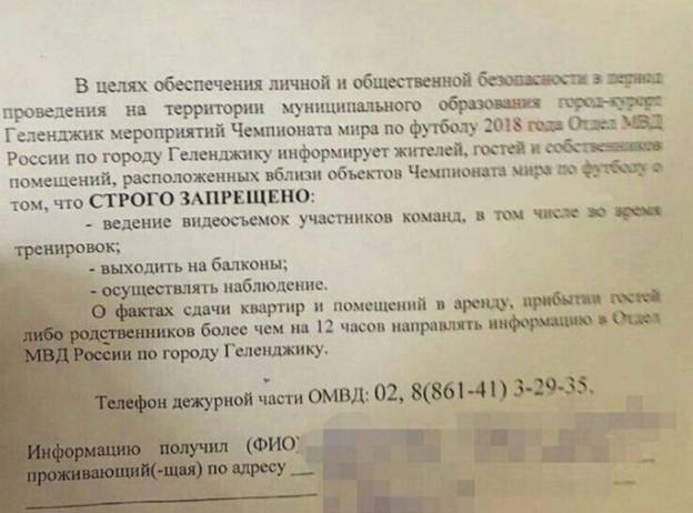 На время проведения Чемпионата мира по футболу-2018 к жителям Геленджика (одного из городов, принимающих Мундиаль) будут предъявлены особые требования. Так, телеграмм-канал FTP опубликовал скан обращения, рассылаемого местным жителям городским ОВД. Из текста обращения следует, что людям, проживающим вблизи от объектов Чемпионата, запрещено вести видеосъемку участников команд и наблюдать за ними, выходить на балконы, а также приглашать гостей и сдавать квартиры в аренду. В том случае, указано в источнике, если возникнет необходимость в приглашении гостей более, чем на 12 часов, об этом следует незамедлительно сообщить в органы охраны правопорядка. -------------------- Turn off the light, take a deep breath and relax.