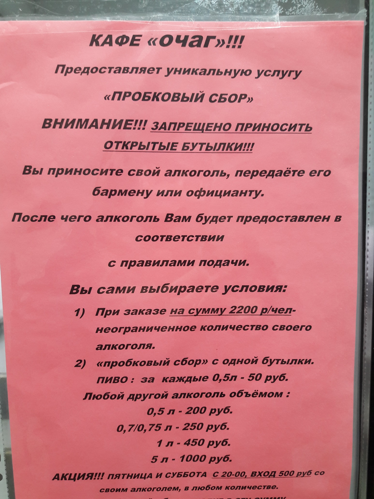 первый раз слышу жду вестей с полей ооопс ... надо же, чутка не успел да, в Очаге всё по взрослому. (где была Партия). только алкоголя у них нет . зато есть вот такое: странная штука надо прицениться ... а обычная еда там как? а может весь номер в том, что у них нет лицензии на алкоголь и получается, что сами они не торгуют, а разливают собственноручно принесенный посетителями им же, ну и на этом денежку в карман кладут -------------------- Turn off the light, take a deep breath and relax.