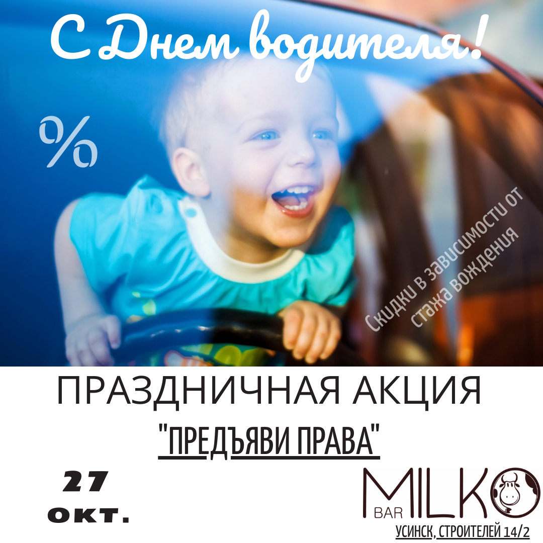 кафе MILKOBAR поздравляет всех водителей с днем автомобилиста и дарит в этот день своим гостям скидку на меню в зависимости от водительского стажа. Предъяви права и получи скидку!
