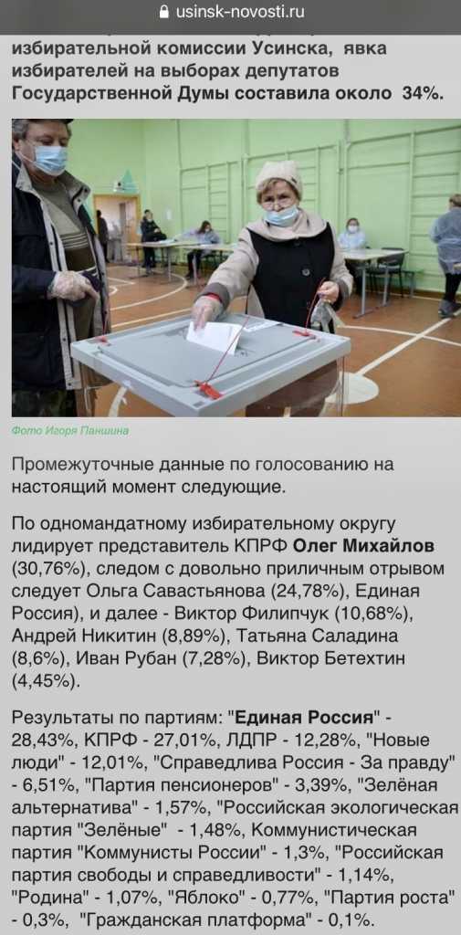 Меня мучает одно смутное сомнение. Ну вот голосует человек по одномандатному округу за представителя одной партии. А по партиям за другую партию? Вроде как не логично...еще и массово не логично получается. Что-то тут не так.... Я голосовал так. В Коми за Михайлова, т.к. реальный кандидат против ЕР который постоянно с ними входит в конфронтацию. В госдуму за партию М.Шевченко, мог бы и за Новых людей, но никак не за парламентские партии. -------------------- Настоящему индейцу завсегда везде ништяк!