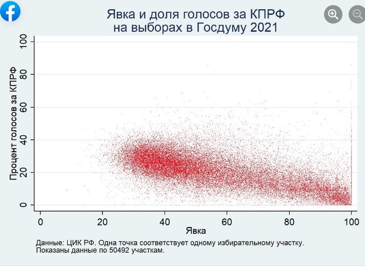 Собственно вот итоги выборов. Графики статистика Алексея Захарова. Густые пятна - нормальный, реальный уровень поддержки партий. У КПРФ И ЕР, он одинаковый (около 37%). Все, что идет разряженной полосой к 100% явки и 100% голосов за ЕР - манипуляции, фальсификации и принуждение, которые "отсасывали" от нормального результата КПРФ и перераспределяли ЕР. КПРФ сегодня - это протестное голосование, включая Навального, а не собственно КПРФ.