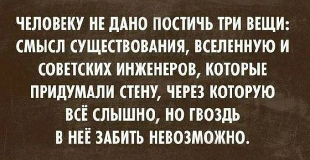 .... Занятия фигней на рабочем месте развивают боковое зрение, слух, реакцию и бдительность в целом. .... Есть три вещи, на которые страшно смотреть с утра после пьянки: лицо, кошелек и список исходящих вызовов... .... Правильно натасканная совесть, никогда не грызет своего хозяина. |