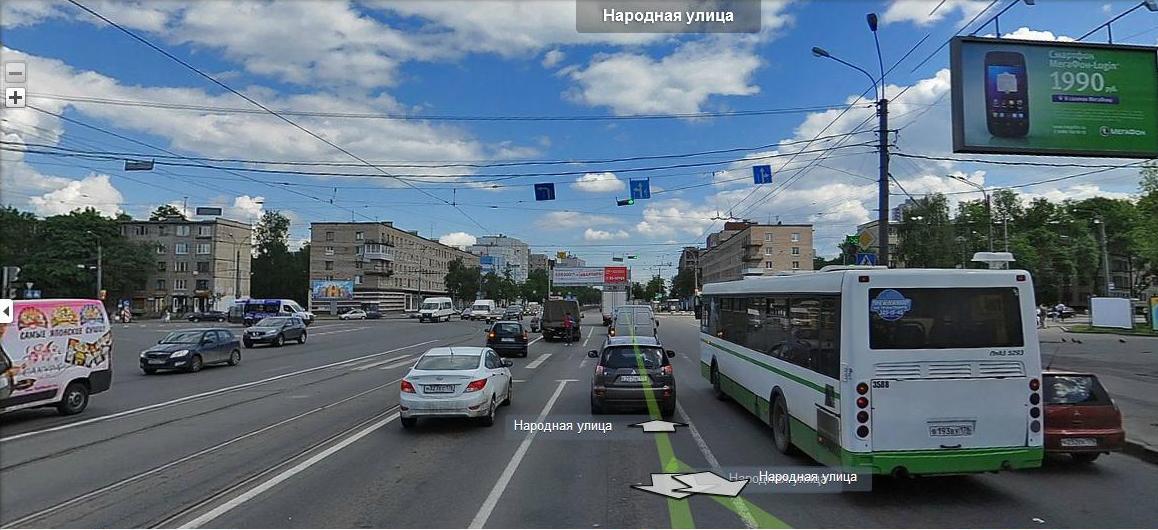 светоносный, самое простенькое описание вот потом вот маленькое "Запомните простое правило: поворот направо должен совершаться из правой полосы на крайнюю правую полосу; поворот налево должен совершаться из левой полосы на любую полосу, кроме встречной." ну и вот это полезно... Просто вкратце...при повороте налево выезжая на нефтяников где три полосы...я могу занять любую полосу...а вот тот автомобиль что поворачивает налево находясь с правой стороны не знаю как он поедет. Тем более что повтор осуществляется через центр перекрестка. А я скажу он или ничего не поймет и врежется мне в бок или как дурак начнет сигналить думая что я его не пропускаю и подрезаю. И опять же..только ДТП и его вина научит читать ПДД Фигня мне кажется, Сань... Вот фотка из яндекс панорам, реального перекрестка, где я частенько езжу: три полосы прямо, три налево, три направо. Поворот налево разрешен из двух рядов, в часы пик многие еще и с трамвайных путей поворачивают. |