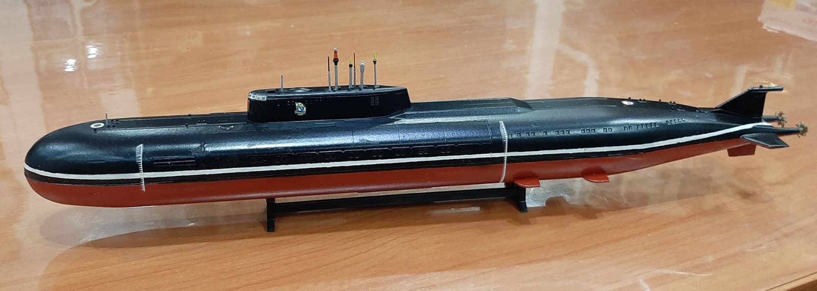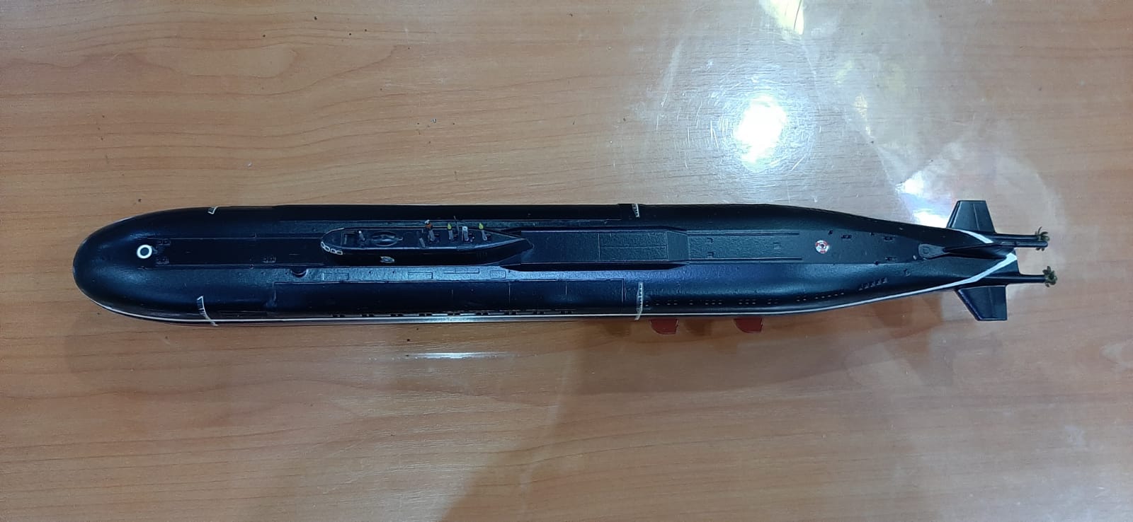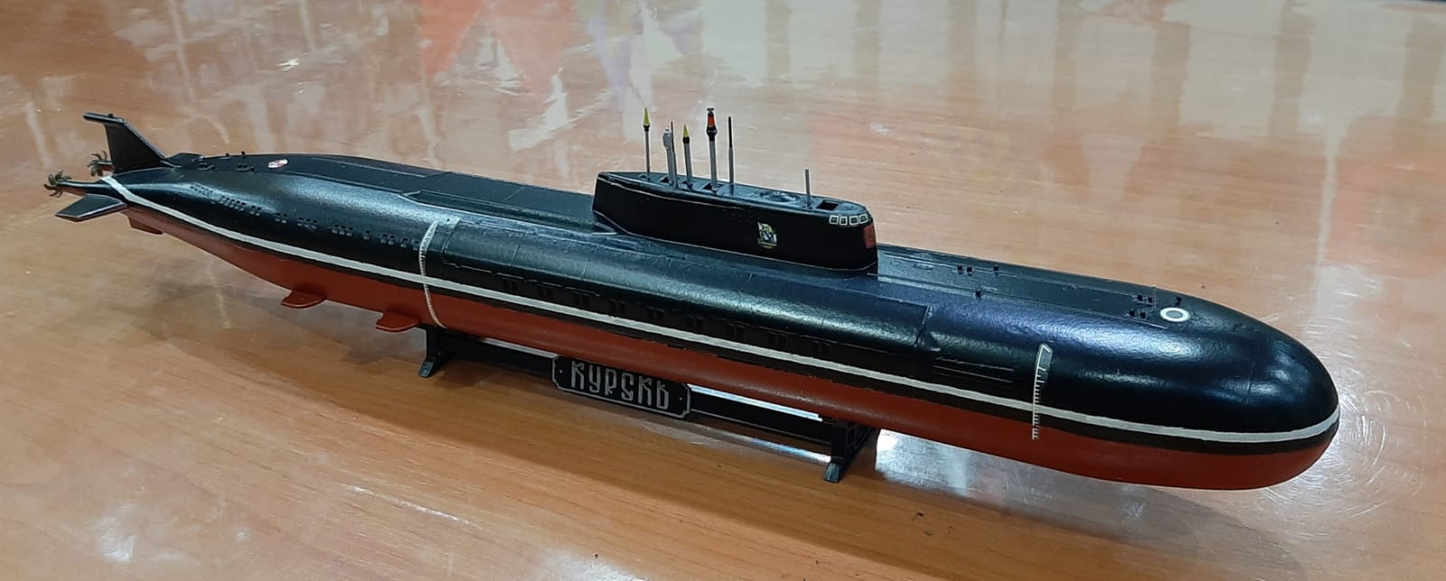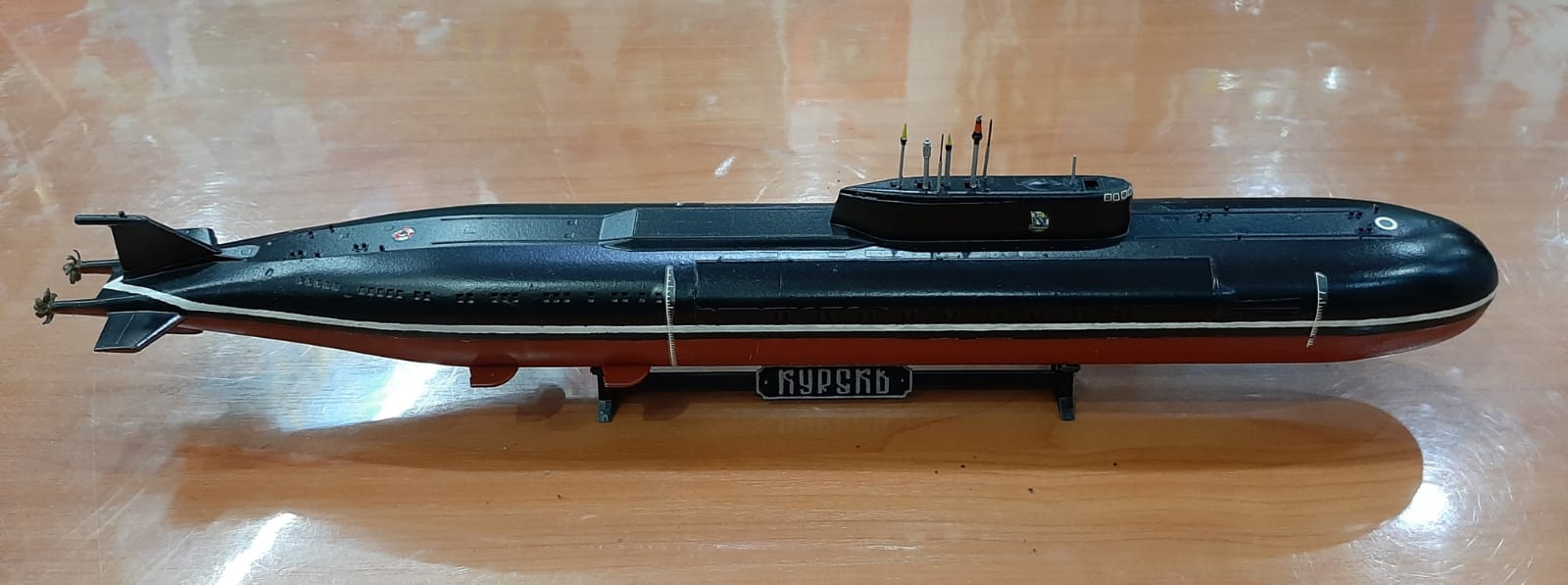 Немного переборщил с лаком )))) Пыль легче сдувать будет. Модель посвящена памяти нашего земляка Халепо Александра Валерьевича, погибшего на АПЛ "Курск" в 2000 году в Баренцевом море. Модель ушла в музей и будет находиться под его портретом. Мир праху героя, вечная память всем погибшим морякам!