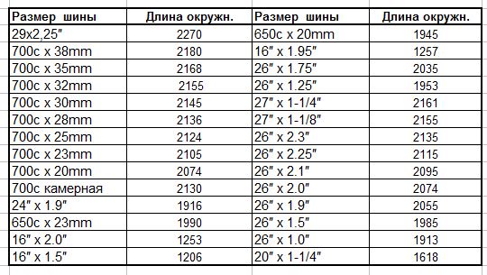 Настройка основного параметра велокомпьютера Спойлер Для настройки скорости и пройденного расстояния необходимо правильно ввести значение длины окружности в велокопьютер (ВК). Исходя из неё счётчик и будет рассчитывать скорость и пройденный путь. Рекомендуемый способ определения длины окружности. При рабочей нагрузке (под весом байкера) и рабочем давлении (любимое используемое давление) колеса замеряем длину окружности полного оборота колеса. И забиваем в ВК. ********************************************************** Для справки. Очень приближенные значения для разных размерностей колес можно посмотреть в след таблице (использовать не рекомендуется - не учитываются разные рисунки протектора и другие различия в размерах покрышек разных фирм.): Значения ориентировочные и, если сравнить инструкции разных производителей, то можно заметить, что для одного и того же размера колеса могут отличаться. На самом деле путь проходимый колесом зависит ещё и от типа дорожного покрытия, давления в шине, веса велосипедиста. Кроме того любой велокомпьютер имеет некоторую погрешность. Факторы, влияющие на погрешность показаний ВК: - Величина давления воздуха в камере колеса. Когда давление мало, под весом байкера уменьшается эффективный радиус колеса, что ведет к завышению показаний ВК. Например, деформация покрышки на 1 см приводит к увеличению показаний примерно на 3 %. - Место установки датчика (на передней или на задней вилке). Дело в том, траектория движения переднего колеса по поверхности дороги более извилистая, чем заднего. Соответственно, при установке датчика на переднюю вилку (что предусмотрено у абсолютного большинства ВК) показания будут завышены по сравнению с установкой датчика на заднюю вилку. Более того, это завышение зависит от индивидуальных особенностей «пилотирования» байкера и скорости велосипеда. При желании можно настроить велокомп с погрешностью ± 0,5 % После предварительной установки длины окружности колеса надо произвести его уточнение. Для этого следует накачать камеру до Вашего любимого давления, обнулить счетчик дневного пробега и проехать в своей обычной манере мерную дистанцию, в качестве которой лучше всего использовать стандартную беговую дорожку стадиона (пустите велосипедистов на стадион!) длиной 400 м. Кстати, если ехать на расстоянии 30 см (половина ширины байка) от бровки, то увеличение дистанции будет около 2 м на один круг. Проехав 10 кругов (4020 м), отметьте показания Вашего ВК. Теперь можно рассчитать эффективную длину окружности колеса по формуле: Lнов = Lстар * Sмерн / Sвк где: Lстар - длина окружности колеса, первоначально введенная в ВК; Lнов - эффективная длина окружности колеса; Sвк - расстояние, показанное ВК при прохождении мерной дистанции; Sмерн - мерная дистанция (4020 м). Пример. Вы установили для покрышки 26х1,9 длину окружности 2055 мм (по таблице). После прохождения 4020 м ВК показал 4,12 км. Определяем Lнов: Lнов = 2055 * 4020 / 4120 = 2005 Для обладателей GPS-навигаторов можно рекомендовать ещё один способ (для Усинска не подходит – нет ровных участков дорог). Выберите равнинный участок шоссе протяженностью около 5 км. Обнулите запись трека навигатора и счетчик дневного пробега велокомпьютера. Проедьте указанную дистанцию в любимом Вами стиле. Навигатор подсчитает длину проекции трека на поверхность геоида (математической модели формы Земно
