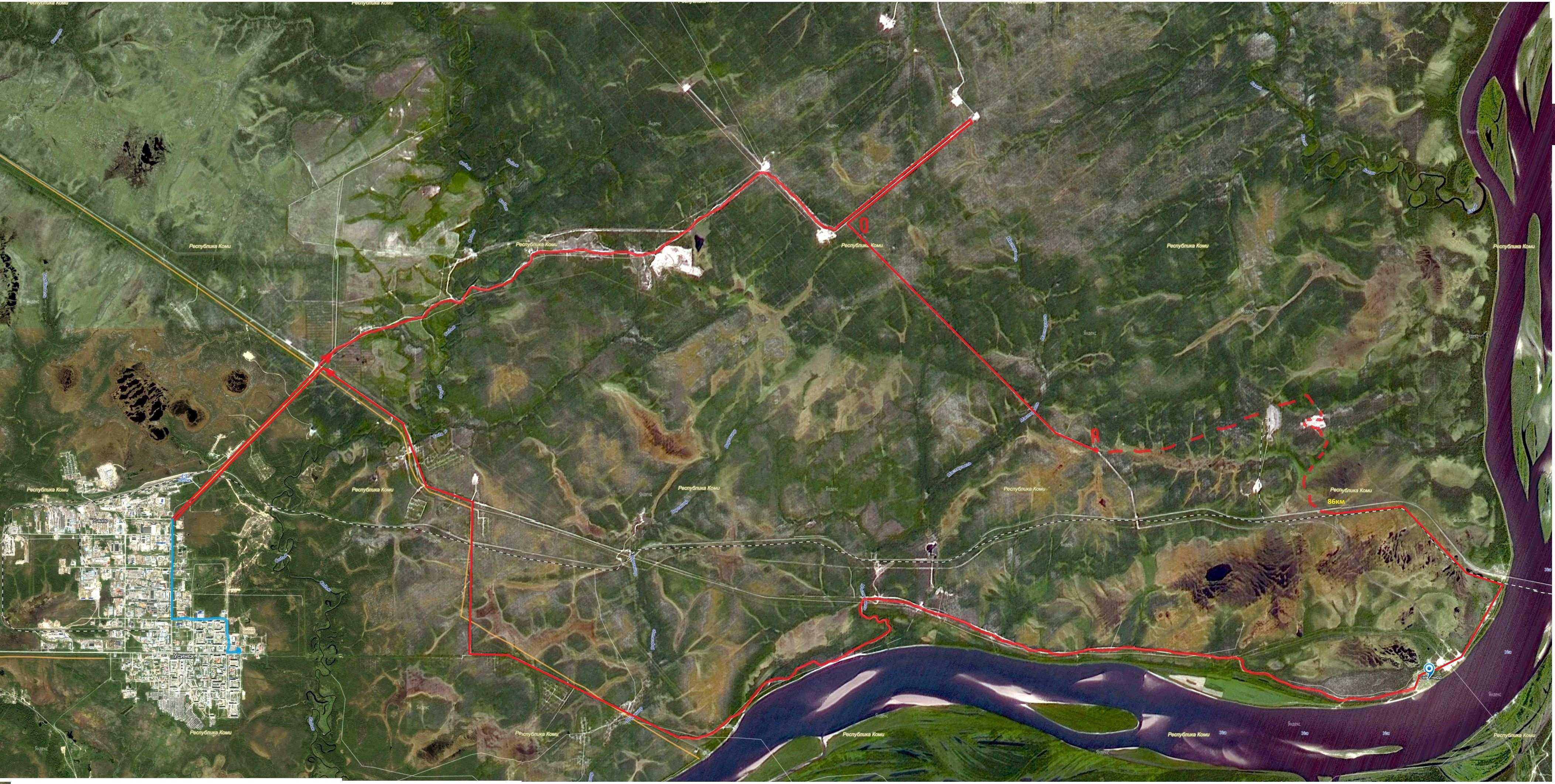 прокатился по маршруту - 0 км - кусты комнедра - карьер "сы нянюр-2" (ооо геостройтехнология) - мост через р.Уса - п. Сынянырд- обратно по водозаборной дороге до Усинска.
