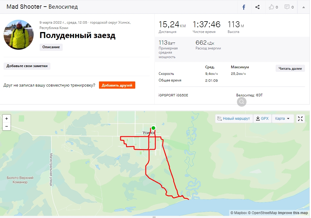 Mad-Shooter, скоро новый сезон! :-) Ещё пару месяцев. А у тебя маршрут на швейную машинку похож :-) Где найду в лесу проезжаемую дорогу там и катаю. Снегоходы их в лесу много накатали )) -------------------- |