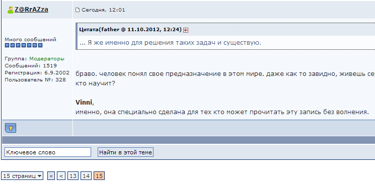 Посмотри в треше. ps Смешно. Если нажать на пимпу ОТВЕТИТЬ, то сообщение становится видимым.) Если игнорировать в натуре... То виден выбор и совершенно не работает воспитательная часть.) ![]() Ну я себя нарушителем не считаю (я даже мат применил в реверсивной форме, как-то) ...ну может немного параноик и сильно мнительный... Но считаю поведение некоторых модераторов не корректным. Обсуждать не буду. Жалоб писать админу не буду. Разберусь сам... А может и не разберусь. Я же только учусь.) И по этому могу и ошибаться. |