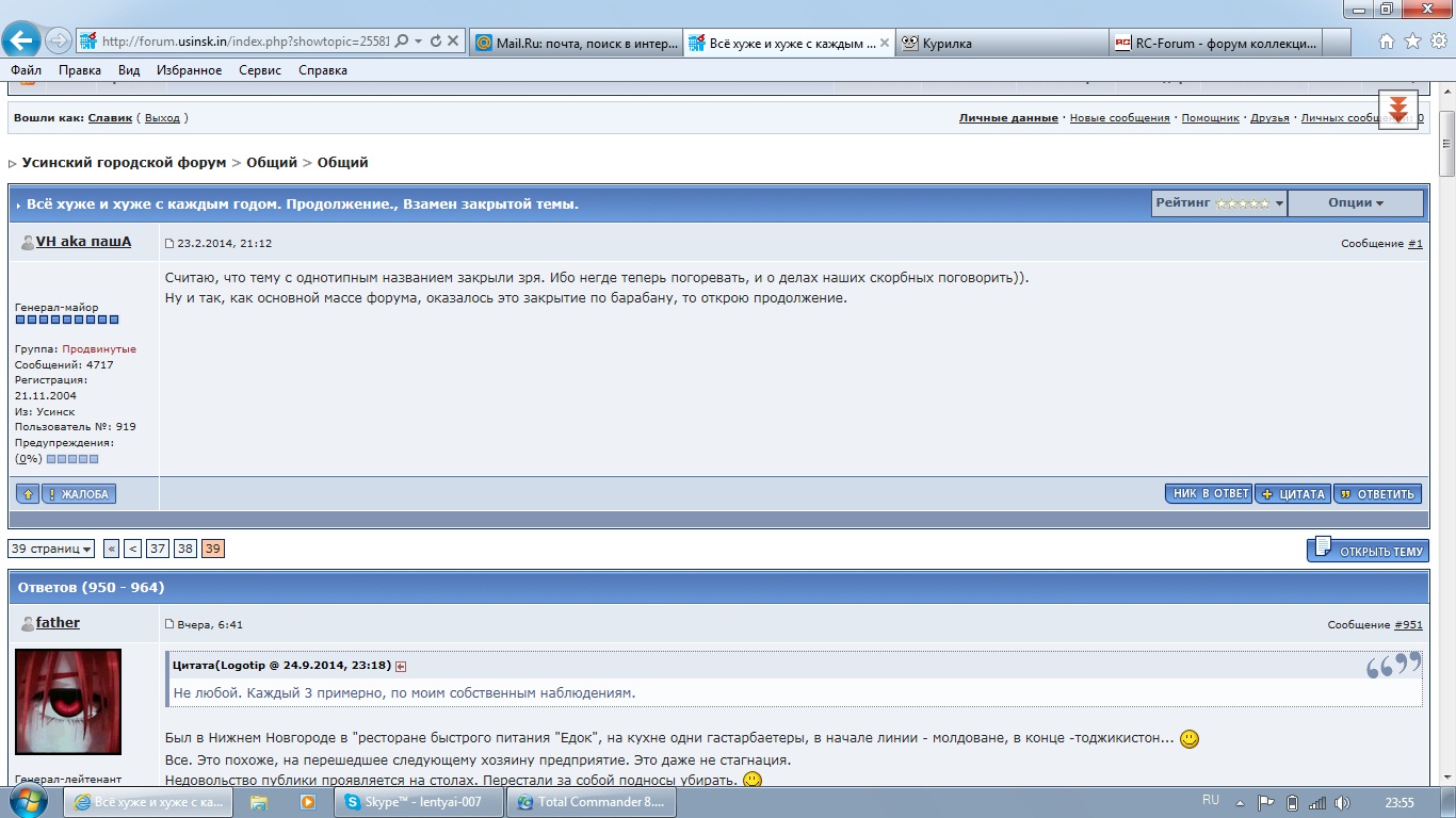 AV это у меня у одного в каждом топе висит вверху первым, первое сообщение из топа, а далее последние или глюк? Сначала подумал, что что-то глюкануло. Славик, это долгожданное (некоторыми форумчанами) удобство. Которое реализовано переключением отображения стиля топика на "Линейный". На самом деле, это ни какое не удобство. Удобство, это когда шапка всегда открыта. Например вот так: , видите на какой странице топик открыт?ps браузеры Фаерфок (по умолчанию всё, ОК), Опера (линейное отображение, по умолчанию.) Сообщение отредактировал father - 27.9.2014, 6:08 |