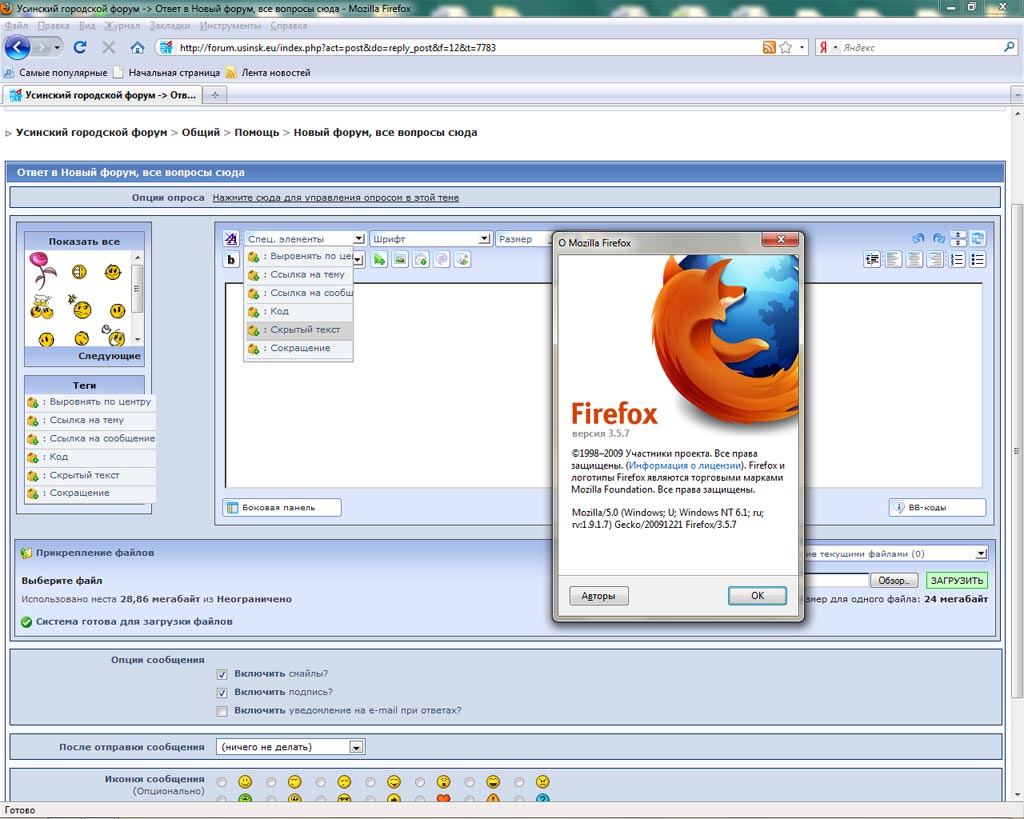 Mozilla/5.0 (Windows; U; Windows NT 6.1; ru; rv:1.9.1.7) Gecko/20091221 Firefox/3.5.7 Работает все. И загрузка файлов и выпадающий список и быстрое редактирование поста. Может у кого не работает обновить версию? Кэш почистить? Пошаманить как нибудь? Лучше бы ты не шаманил. Будет время заедь ко мне глянь, нашим местным шаманам некогда. -------------------- Настоящему индейцу завсегда везде ништяк!