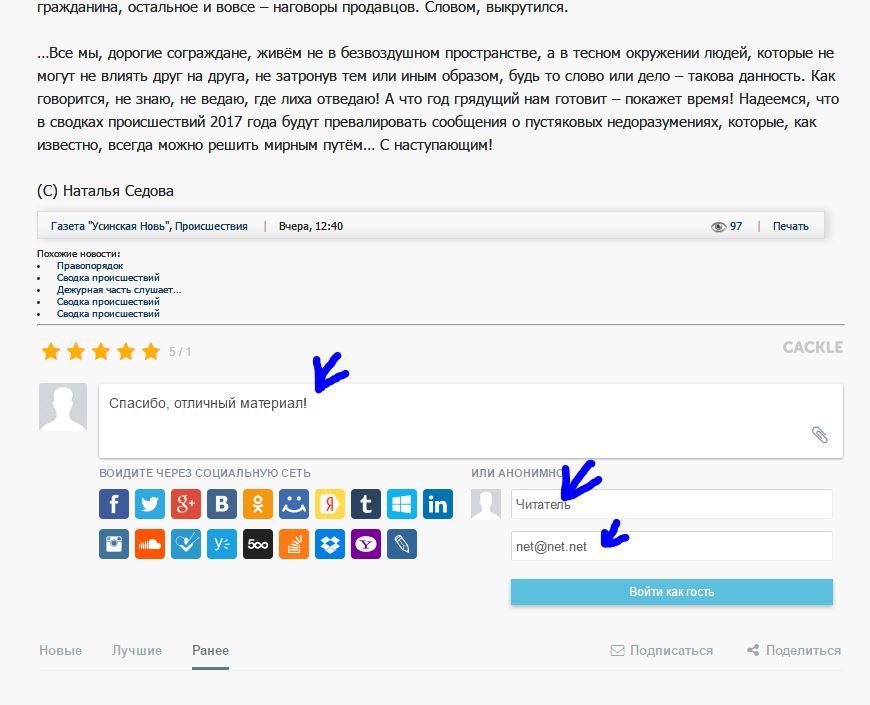 Давно не используемые аккаунты - удаляются. Смысла иметь там аккаунт уже не стало (если, конечно, ты не надумал писать статьи на сайт). Прикручена система комментариев которая имеет более комфортный функционал. Можно комментировать используя свой аккаунт из соцсетей (на выбор), а можно анонимно и т.д. Анонимно не нашел, а под фамилией и именем писать не стал. Седова написала самую оригинальную сводку за последние 15 лет что я видел. Хотел сказать что газета меняется в лучшую сторону, раньше тупо просто переписывали из милицейских сводок их же языком. -------------------- Настоящему индейцу завсегда везде ништяк!