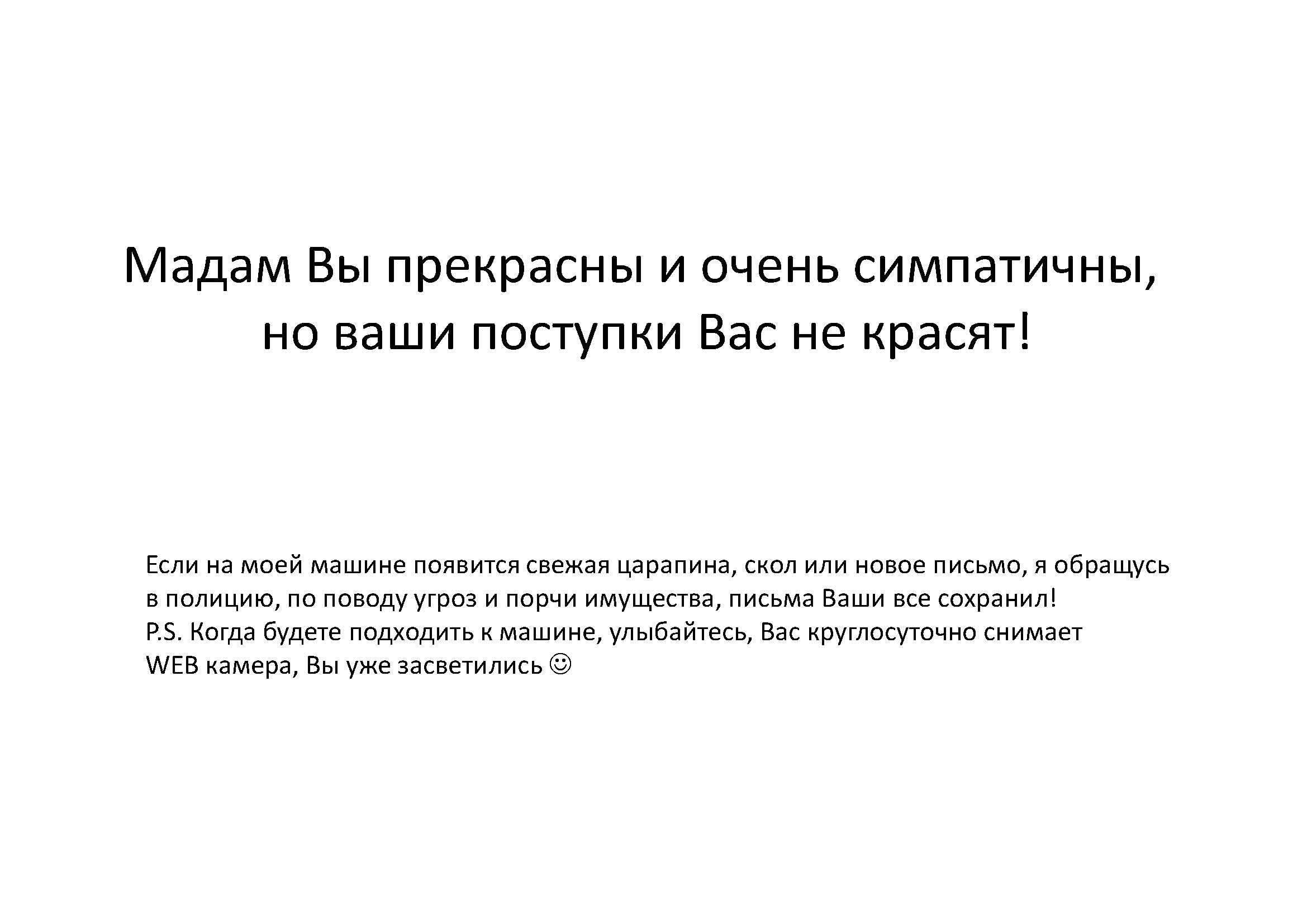 100% это баба, при чем наглая, тупая и не битая. Надо бы чтоб ей мужик пару раз съездил между глаз, для просветления мозгов. Слава, если знаешь что у неё за машина, сделай копии этих бумажек и положи ей под дворники. Кстати забыл тебе сказать прошлый раз - бумага сохраняет на себе отпечатки пальце и пото-жировые следы. Постарайся сильно не юзать эти записки. Если что случится с машиной они будут вещдоками. А когда новую обнаружишь, акуратненько за уголок в файлик и с заявой в полицию сразу. -------------------- Настоящему индейцу завсегда везде ништяк!