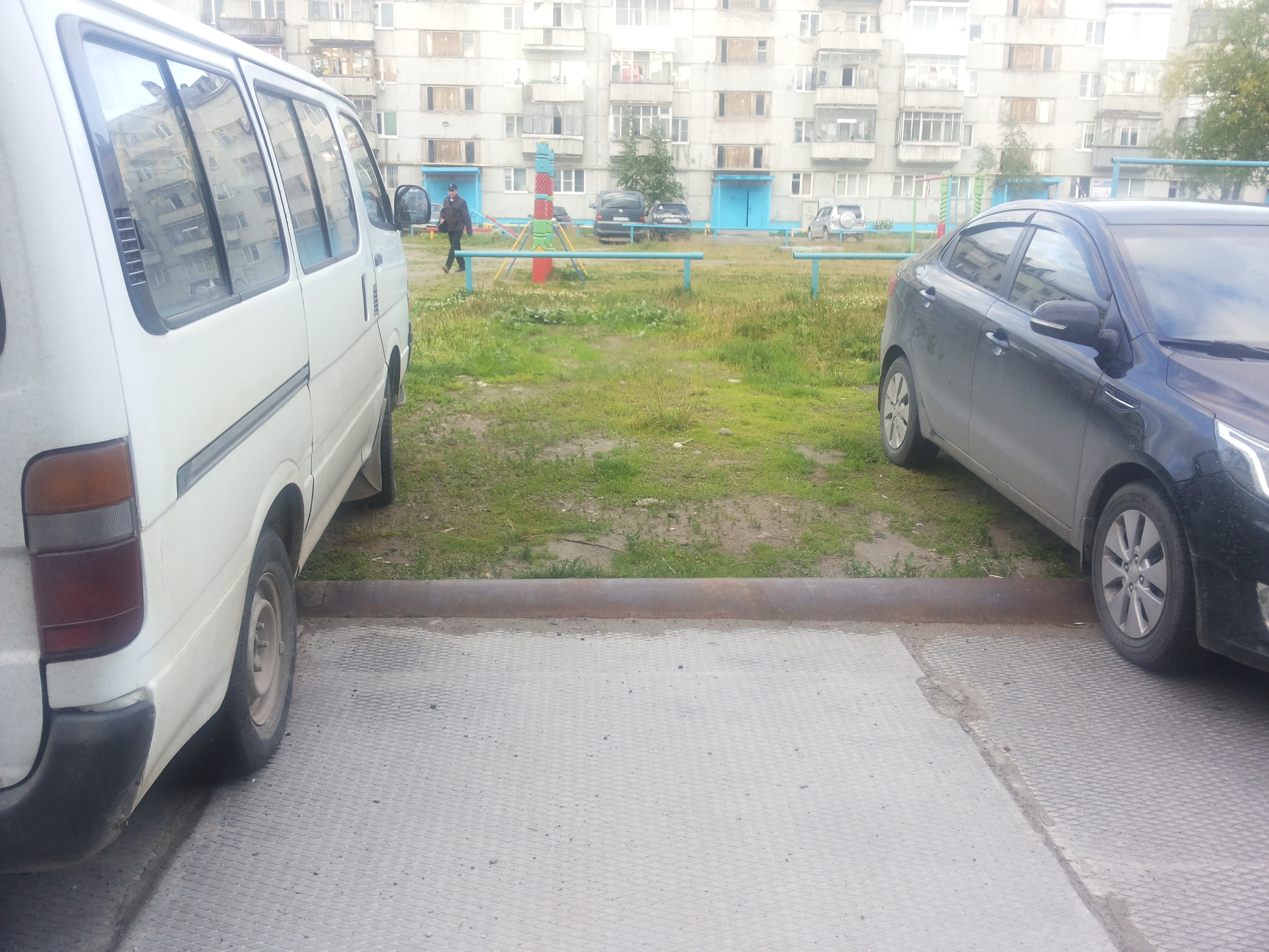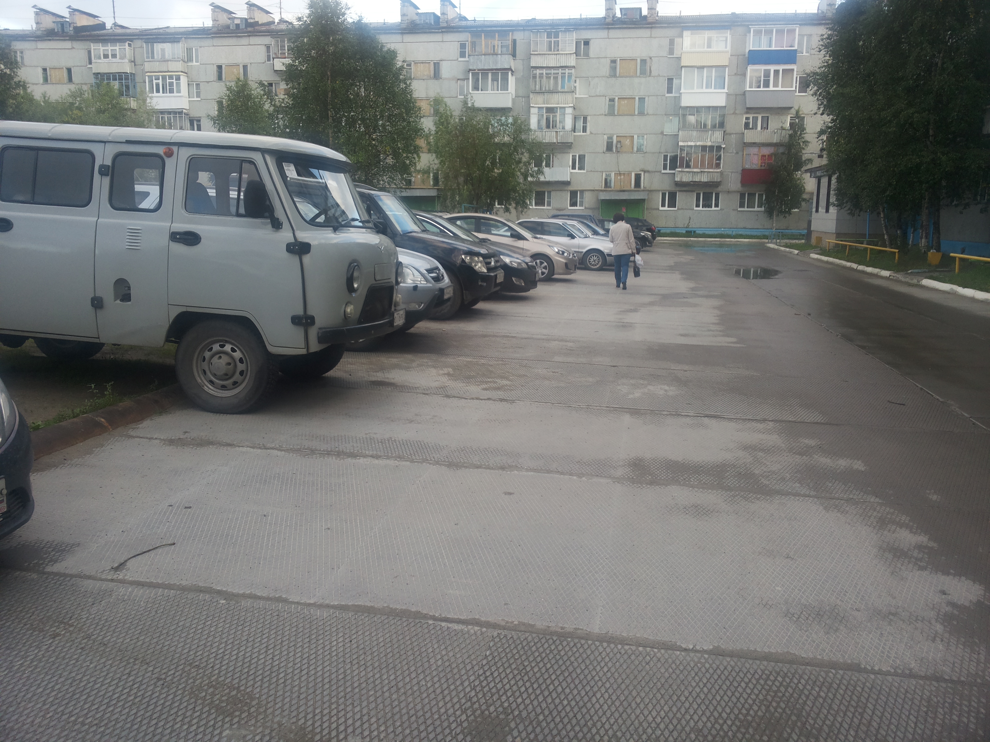 "А мы всё равно на газон залезем." Во дворе на ул. Строителей. Там больше некуда машины ставить, кроме как частично на газон. Когда возле строителей 5 клали плиты, то могли бы положить плиты и для стоянки авто. Вобщем водители тут не причем. Машины тупо некуда ставить. |