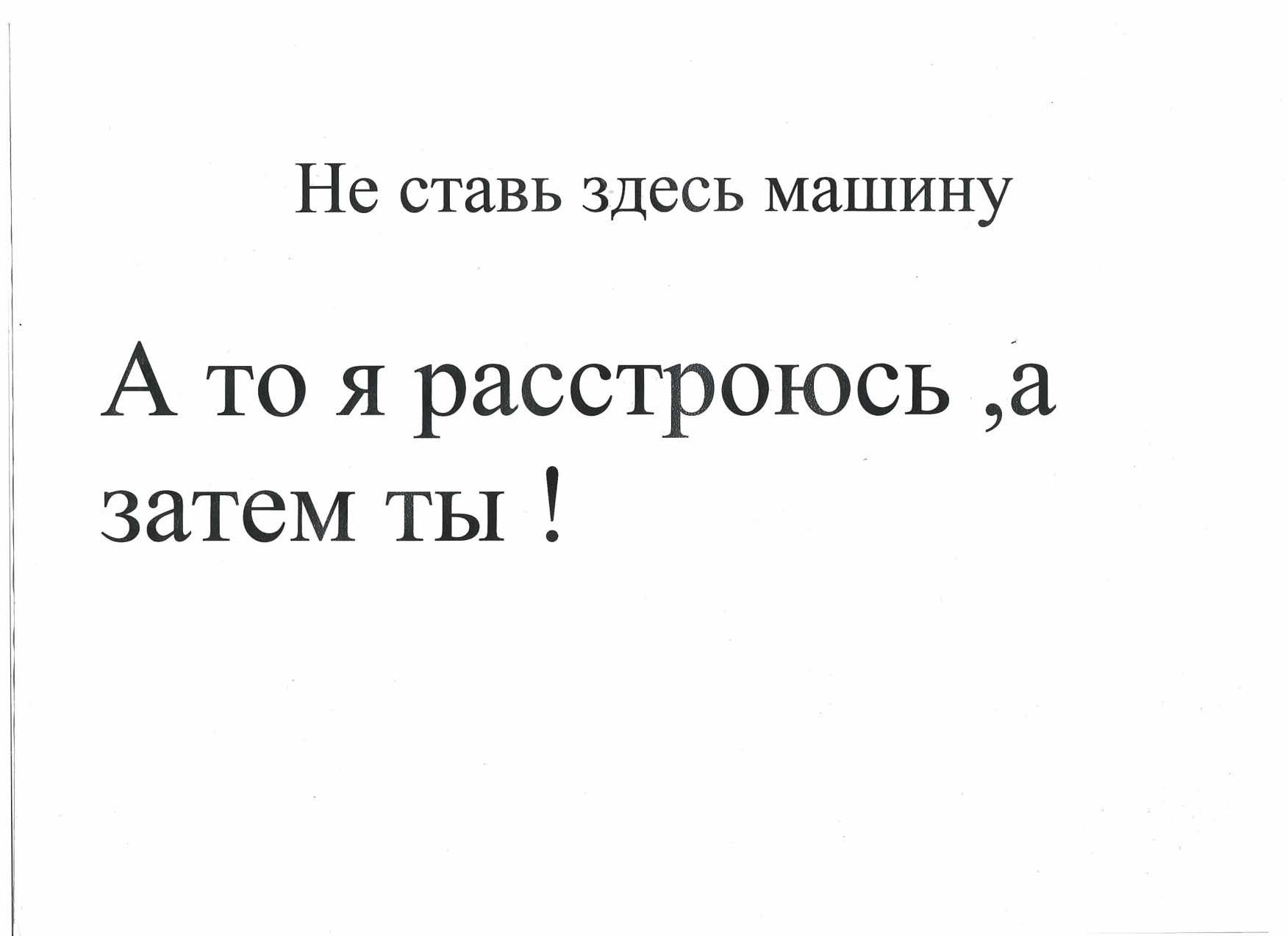 а про парковки во дворах...вот вы злые люди. Сегодня паковались во дворе,ну нет места перегородили авто,повесили табличку с номером... и все нормально. А вот такие безголовые которые водой или еще чем....это вообще безумные люди. и они еще говорят о культуре. -------------------- "Помни, не страшно быть гордым