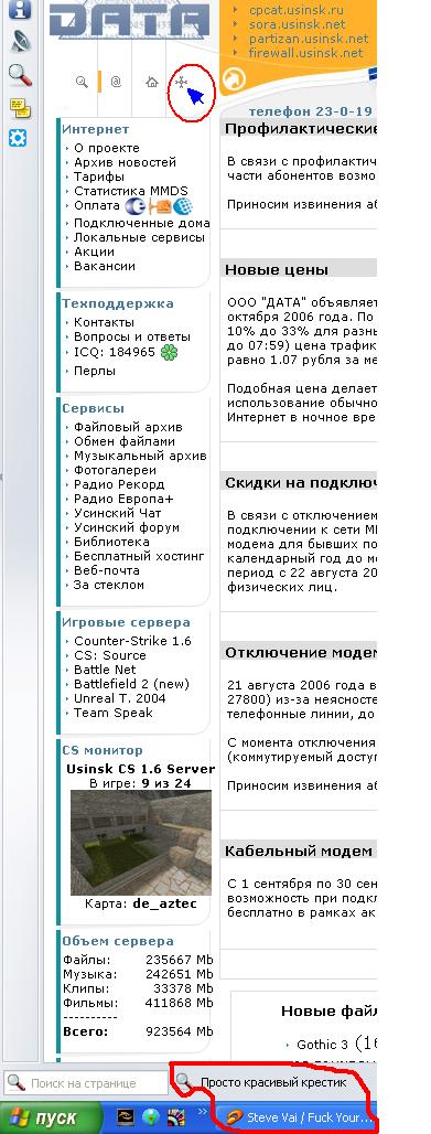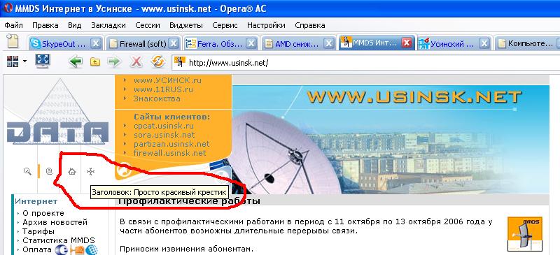 У меня Опера AC 3.3.5 - Final (Opera9.02 (сборка - 8585) И вот я заметил, что она (опера) может показывать, что за крестиком p.s.Раньше эту надпись тока Ишак показывал Альтернативный текст, как гласят стандарты, должен показываться при невозможности загрузить изображение - в текстовых, речевых браузерах, при сбое или отключенной графике. Там же написано, что он должен содержать пустую строку для вспомогательных изображений, вроде рамок или разрядки, и описание изображения для всего остального - это значит что на кнопке Home должно быть написано "Маленький домик с синей трубой и кривой дверью (5K)", а не "На главную страницу". Для всплывающих подсказок определен title=" ... ". Вот title - это совместимый способ отображать всплывающие подсказки, и он работает во многих браузерах... кроме старого Netscape Communicator <=4.7 и еще более старого Internet Explorer и некоторых версий Opera. Обратите внимание, нигде в стандарте не сказано, как юзер агент должен поступать, если картинку удалось отобразить. То есть тут Internet Explorer не противоречит стандартам. И тут на арену выходит Ian Hickson (Hixie), в частности, занимающийся разработкой CSS в составе команды W3C, заявляет, что поведение Мозиллы противоречит стандартам, и что если alt-текст будет всплывать, его будут использовать для всплывающих подсказок, а если не будет - то по назначению, и поддержку всплывающего alt-текста из Мозиллы убирают. Был создан баг в Багзилле на эту тему https://bugzilla.mozilla.org/show_bug.cgi?id=25537 - (Warning 56k) Alt text is not displayed as a tooltip over <img> (image) - один из самых громадных по объему обсуждений, и рекордсмен по количеству дубликатов. Были высказаны соображения, что в результате такого поведения пользователи могут потерять часть информации сайта, и приведены примеры, что абсолютное большинство сайтов либо никто не будет менять, либо менять очень сложно, либо и некому, что те веб-мастера, которые знают о данном эффекте, а таких меньшинство, как правило, просто дублируют alt-текст в title-атрибуте, в результате чего код увеличивается, а альт как использовался не по назначению, так и используется. Но это же Хиксмэн, он не только невразумляем, но и не хочет нормально вести дискуссию - почти не отвечает на замечания по делу и сам высказывается обычно неаргументированно. смотрим на исходник сайта и видим: src="images/r4.gif" width="28" height="20" alt="Просто красивый крестик"><br> все там больше ничего нет... -------------------- На этом форуме только уважаемые лица