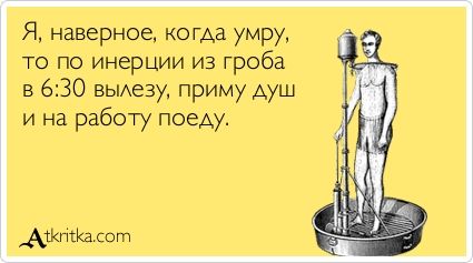 .... Занятия фигней на рабочем месте развивают боковое зрение, слух, реакцию и бдительность в целом. .... Есть три вещи, на которые страшно смотреть с утра после пьянки: лицо, кошелек и список исходящих вызовов... .... Правильно натасканная совесть, никогда не грызет своего хозяина. |