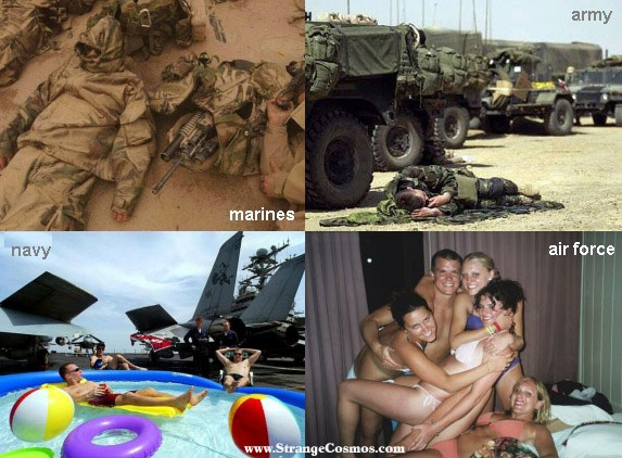 Haircut Standards MARINES: Heads will be shaved. ARMY: Stylish flat-tops for all recruits. NAVY: No haircut standard. AIR FORCE: Complete make-overs as seen on the Jenny Jones show. -------------------- [b]"Толпа так же напоминает армию, как куча стройматериалов дом." "ВОЙНА-ЭТО ИСКУССТВО ОБМАНА" (Сунь Цзы)