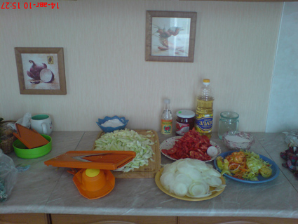 продукты: 0,5 томатного соуса (покупаю кировский "Принто"), 2 ст.л соли, 0,5л воды, 1 стакан сахара, 1 стакан подсолнечного масла, 1 ст. л 70% эссенции, 10 луковиц (не очень больших), 2 кг кабачков, 5 шт сладкого перца, 10 шт помидор (средних). Смешать соус, воду, песок ,масло, эссенцию, довести до кипения, добавить 10 луковиц, порезанных колечками. Варить 10 минут. Затем кабачки брусочками (можно кубиками, я строгала для ускорения процесса все на терке) ,варить 10 минут. Затем перец, варить 10 минут. Затем помидоры и снова 10 минут варить. Горячими разлить в банки и закатать. Я банки не стерилизую, мою и ополаскиваю раствором уксуса. На всё про все ушло час. Про огурчики в горчичном соусе мне мама рассказала, её коллега угощала, рецепт она конечно не привезла, я его в интернете нашла. не выкладывала пока не попробовали. Теперь говорю, что очень вкусно (пока готовили ТАКОЙ аромат шел, что хоть в магазин за водочкой беги...). Добавлю от себя, что если перец сами молоть будите, хватит и 1 ложки с горкой. И насчет стерилизации в 15-20 минут ,если кастрюля с толстым дном и из нержавейки, хватит и 10-15 минут (хрустеть не будет огурчик тк сварится за 20 минут). Вообщем как они цвет начали менять ,я сняла с плиты. 4 кг огурцов помыть, порезать кусочками вдоль и сложить в миску или кастрюлю. Туда же мы добавляем: 1 стакан сахара ( можно немного меньше ), 1 стакан подсолнечного масла, 1 стакан уксуса, 3 ст. ложки соли, 2 ст. ложки измельченного чеснока, 1 ст. ложка горчицы, 2 ч. ложки молотого черного перца. Все смешать и оставить на 3 часа, периодически помешивая. Потом раскладываем в литровые банки и стерилизуем 15-20 минут.Закатываем, переворачиваем, а через сутки в холодильник. -------------------- мужчина мечты - это не только "любит и не изменяет", но и делает жизнь счастливой