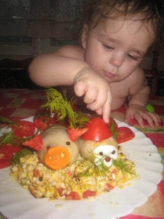 Эксперту не терпелось попробовать))) Пока бегала за фотиком, эксперт приступил к дегустации))) В-общем фаршировала тем, что было в холодильнике: яйцо, сыр, крабовые палочки, семга, перемешала все с майонезом. Получилось очень вкусно! Ну это на мой вкус, конечно же. Папа еще не пробовал, но ему я сделала без семги, потому что семгу в таком виде он терпеть не может.