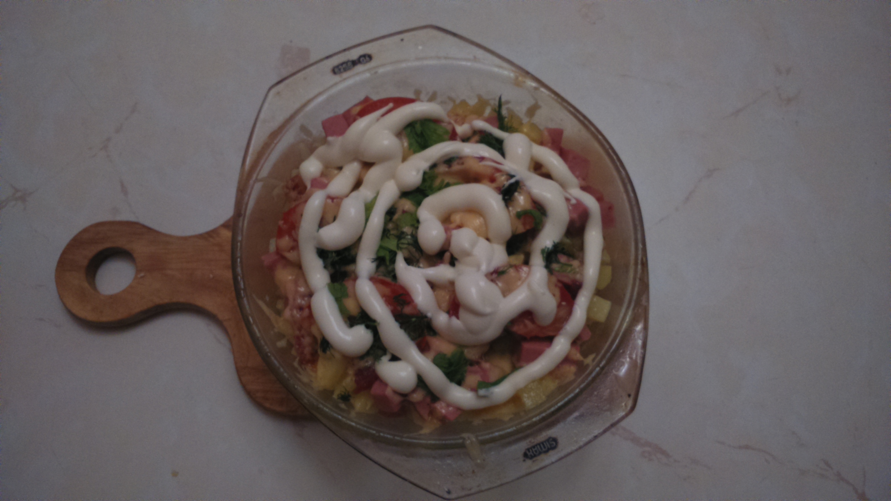 Что это? Горячий салат? Нет! Блюдо имеет другое название, все, что есть в холодильнике Режется картошка соломкой, кубиками, кому как нравится, заливаешь растопленным сливочным маслом, можно растительным, на любителя. Далее накрываешь крышкой, встряхиваешь и в микроволновку на 7-8 минут. Потом в холодильник на поиски то, что есть, обычно остатки разной колбасы, сыр, зелень, чеснок. Микроволновка отыграла 7 минут, достаем и солим и снова на пару минут в нее, далее достаем, картофан перемешиваем с чесноком и начинаем украшать, ложем разную колбаску нарезанную кубиками или соломкой, Помидорки, сыплем сыр с зеленью и уже без крышки снова в микроволновку на 2-2,5 минут. Достаем и сверху майонез, "Гугульмэ" готово А иногда и Доширак вкусный Фу пластмассовую лапшу есть, бэ! Ладно в паровозе еще куда б не шло -------------------- .... Hичто так не укрепляет веру в человека, как предоплата!