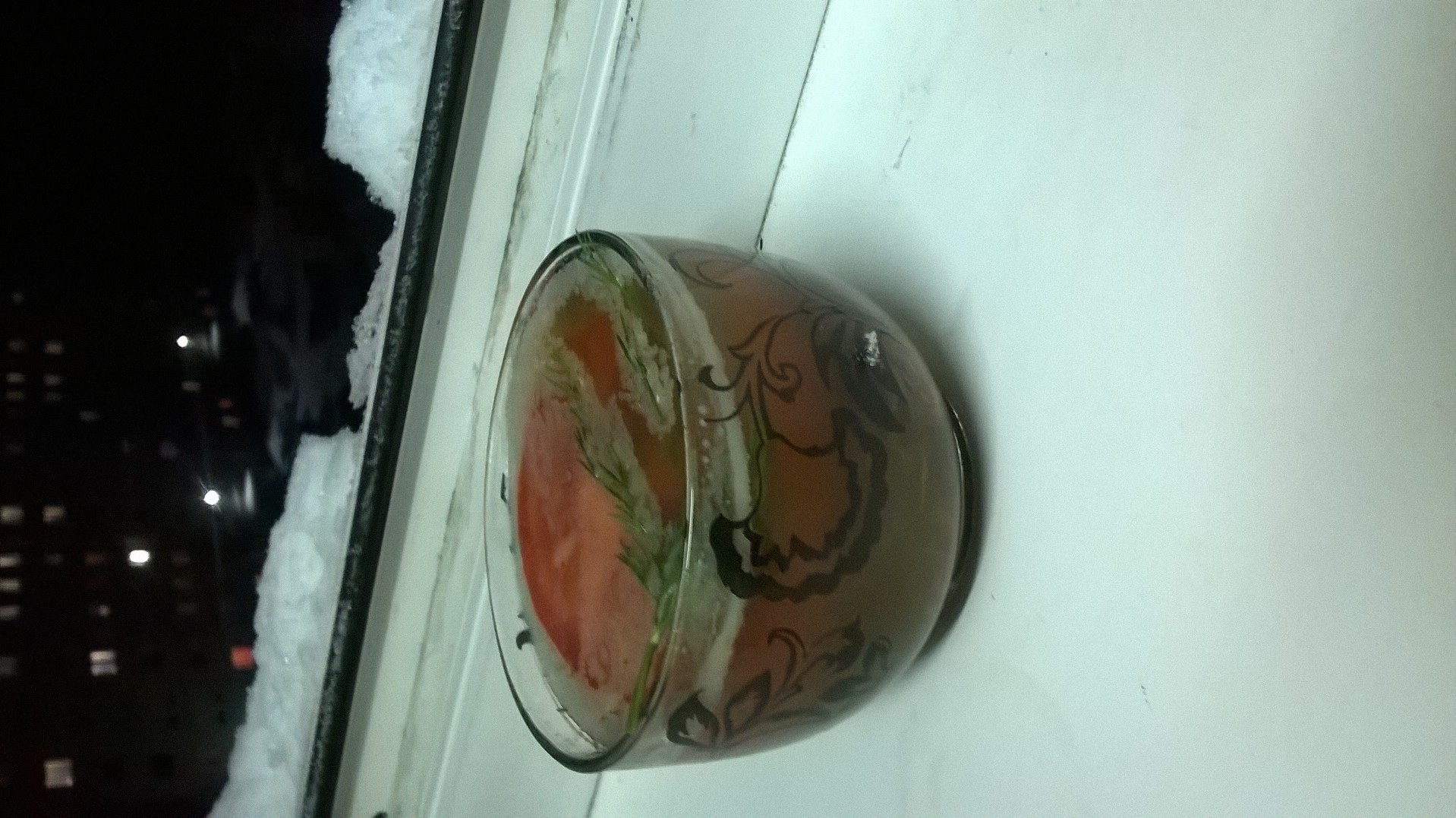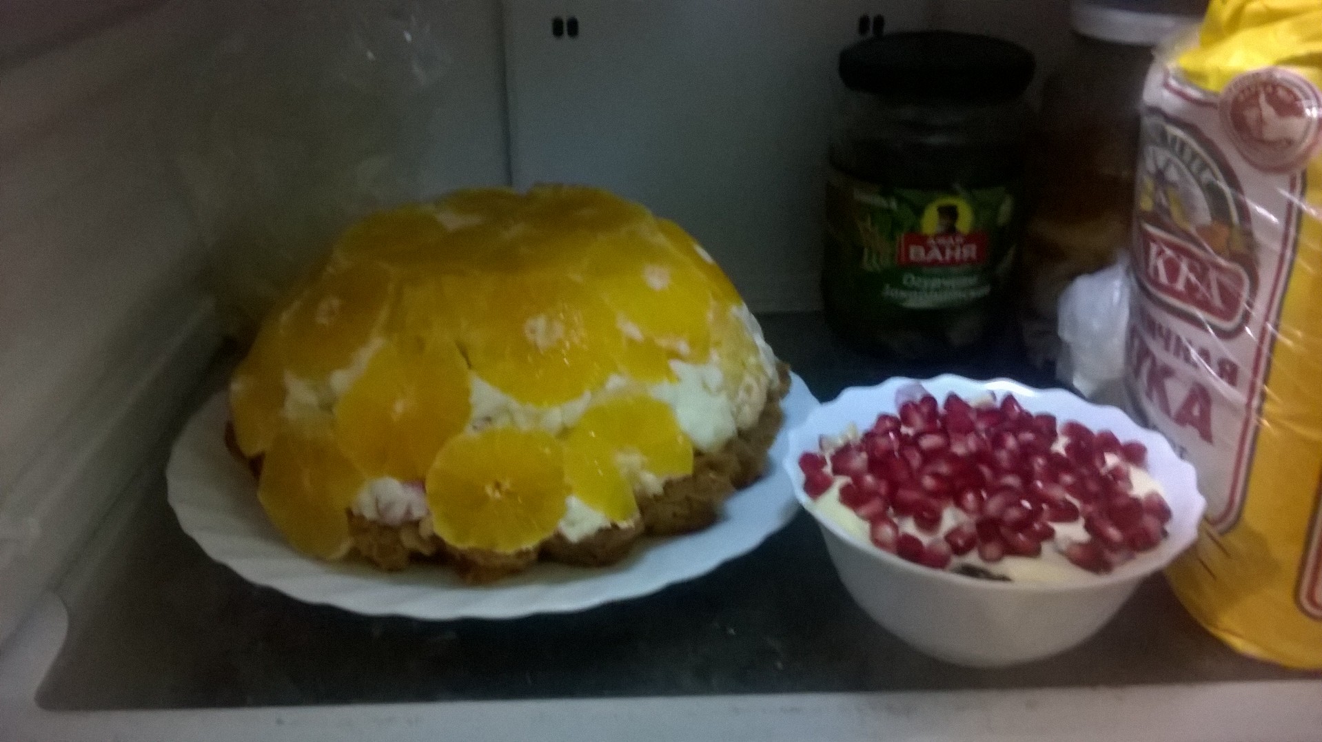 Где-то на окне стандартный оливье. А это любимый бисквитный торт со свежими фруктами и салат "Мужской каприз" (не знаю уж, почему мужской - я от него балдею так, что мама не горюй!) Ну и совершенно неожиданно получился сегодня холодец: варила вчера мясо на салаты, сегодня, думаю, поем бульона, а там такая желешечка. Выварила ещё кусок ноги оленя, добавила чуть специй и на балкон. Сейчас сняла пробу - шикарно! |