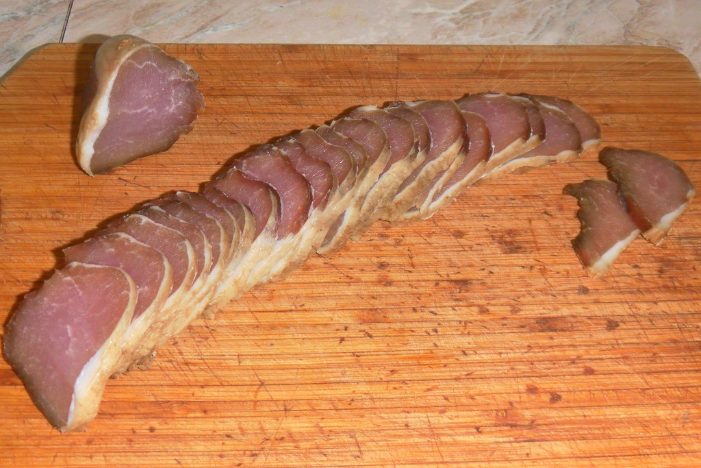 В этот раз фоточку сделал. Солим, сутки стоит, потом заливаем ольховым дымом, сутки стоит. Потом вялим 2 суток и режем.