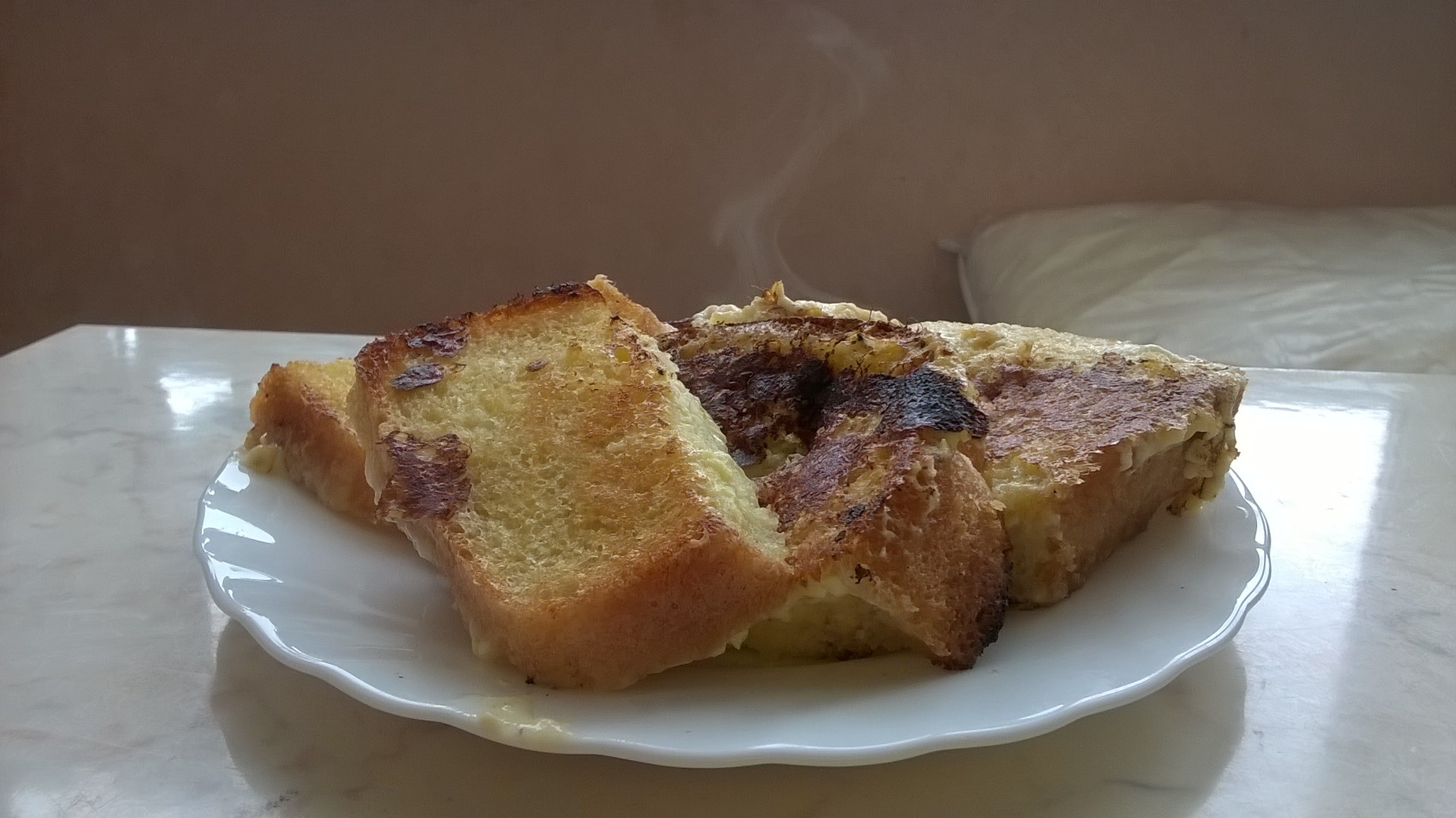 Само блюдо из воспоминаний о детстве. Гренки. В идеале взять нарезной батон, но такого сейчас нет, поэтому подойдут булочки или просто белый хлеб. Вкуснее будет, если будет пористый. Делаем смесь: одно яйцо, сахар (я вообще кладу 4 чайные ложки), ванилин и молоко. В среднем смесь выходит 100-150 мл. Всё надо хорошо перемешать, почти взбить. Затем на сковороде надо растопить масла сливочного и положить туда хлеб. Кому как, а я предпочитаю кусок хлеба располовинить и так готовить, а батон так можно вообще целым куском. Хлеб слегка снизу подрумянивается, а сверху начинаю лить яично-молочную смесь, но очень медленно, ложечкой, на каждый кусок, старая так, чтобы смесь впитывалась, а не стекала на сковороду. Как ни странно, так получается вкуснее, чем если хлеб вымачивать заранее. Потом надо перевернуть гренки. Дальше можно их снять, а можно до снимания вылить ещё по 2-3 ложечки смеси и потом ещё раз перевернуть гренки, чтобы получилась вкусная сладкая оболочка. Модно потом и остатки смеси вылить, но есть риск, что гренки станут слишком мягкими, а то и вообще развалятся. За это время, минут 10-15 тратится, как раз успевает свариться кофе и никуда не убежать. |