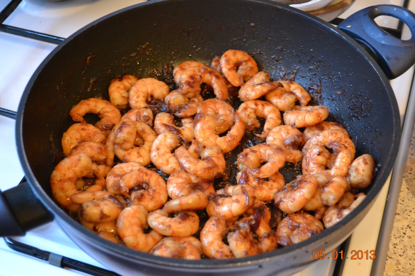 Блюдо, которое я называю "субботником". После пятницы не осталось ничего из выпить, а голова раскалывается и просит "позитива". Просто пойти в магазин = выслушать про то, кем ты стал. Поэтому, есть смысл порадовать семью что: "Сегодня у нас на завтрак королевские креветки в гранатово-винном соусе". Ставим размораживаться креветки, а сами бежим в магазин за гранатовым соком(100%-ным). Сначала пропариваем лук на .... (рецепт подготовки соуса для жарки выше). Изюминка: за минут 5-10 до готовности вливаем 50 граммов гранатового сока и 50 грамм вина в почти готовое блюдо и накрываем это крышкой. Вуаля! Главное: в процессе приготовления никто не мешает пить вино.